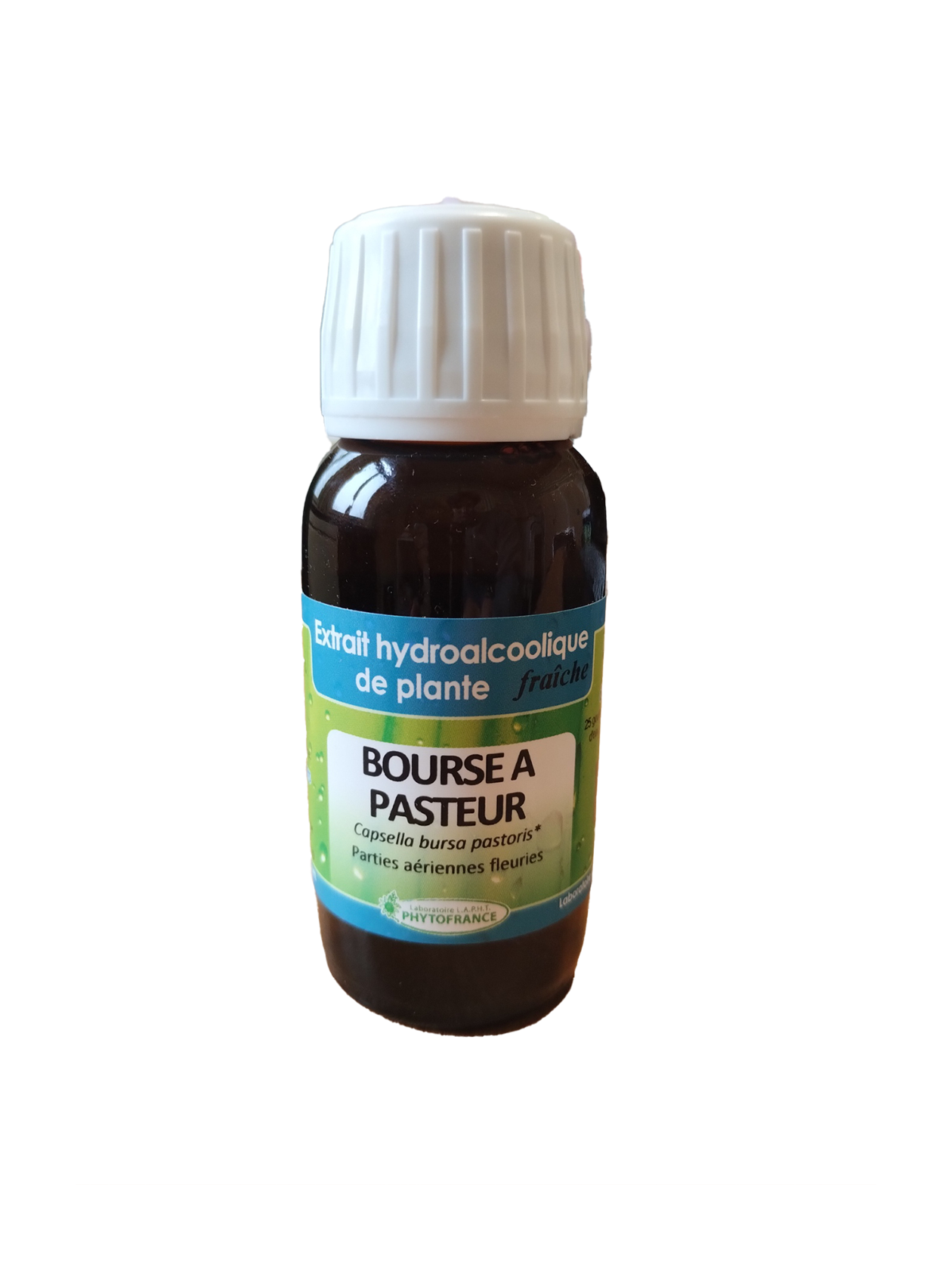 Extrait hydroalcoolique de plante fraîche de Bourse-à-Pasteur (Capsella bursa-pastoris), obtenu à partir des parties aériennes fleuries.