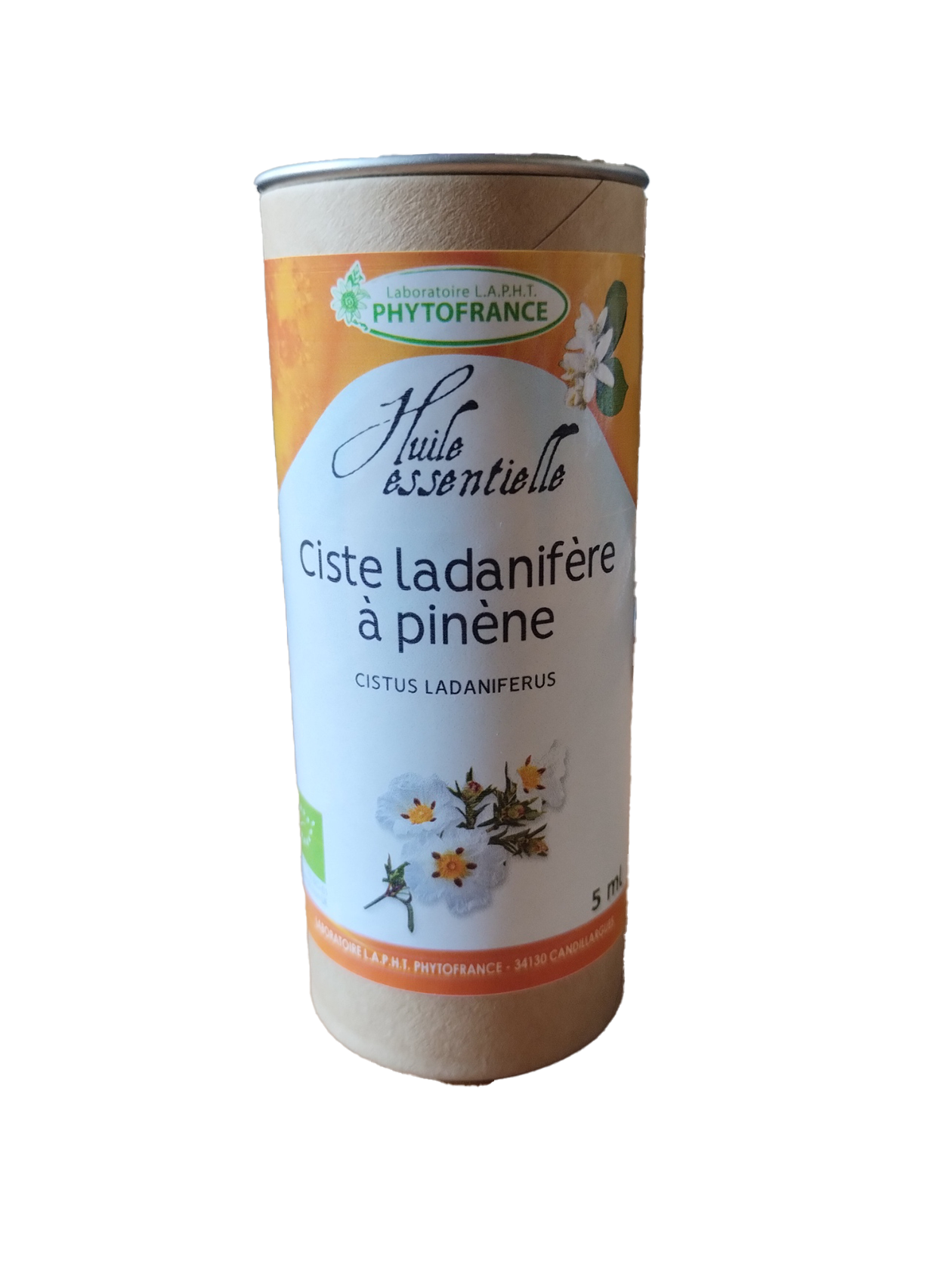 Huile essentielle obtenue par distillation à la vapeur d’eau des rameaux de Ciste en format 5 ml.